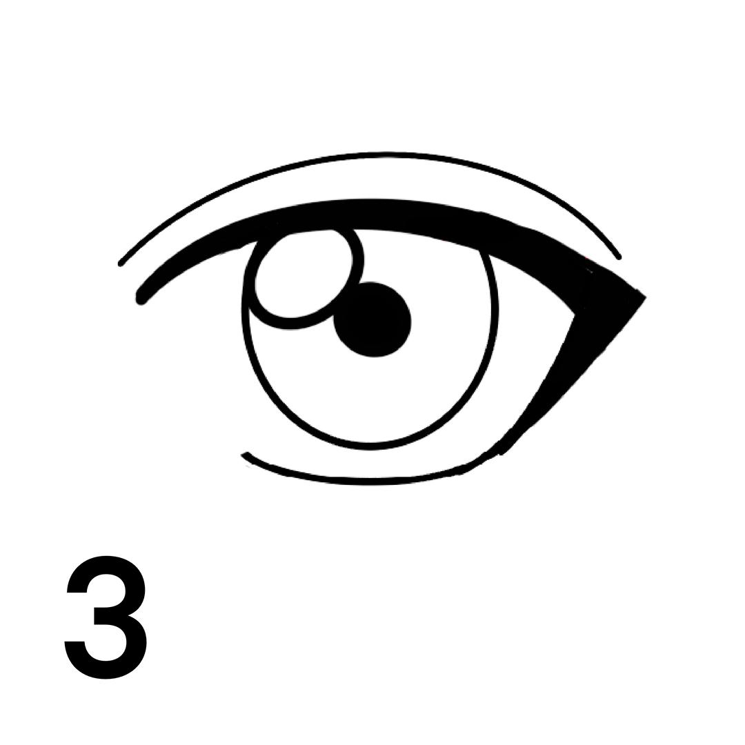 * توضیح کاربردی:در این مرحله از طراحی انیمه، خط پلک بالا را ضخیم و مشکی کنید (این کار حالت مژهها را تداعی میکند). همچنین، یک دایره کوچک سفید در گوشه بالای عنبیه به عنوان برق چشم (Highlight) اضافه کنید تا چشم زندهتر به نظر برسد. یک خط ظریف هم بالای چشم برای پلاک دوم رسم کنید.