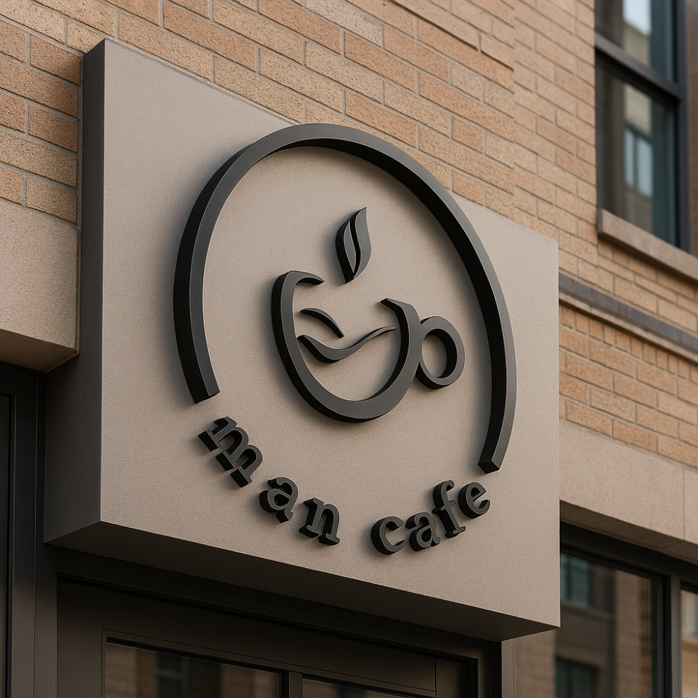 این تصویر برای مجموعه کافه رستوران "من"به صورتی طراحی شده است که کلمه من به شکل یک فنجان قهوه در آمده است.